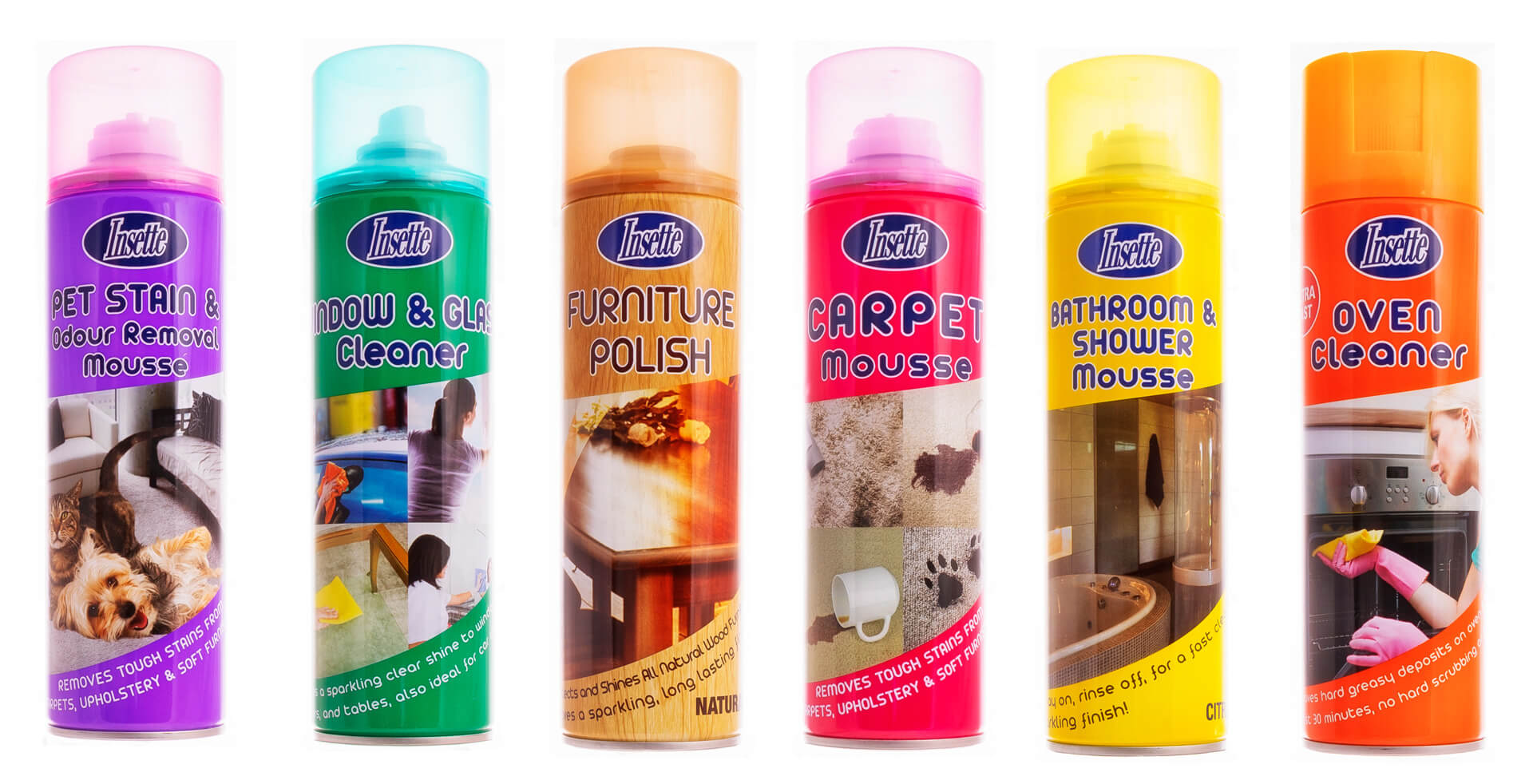 Insette Household range consists of 6 great products, Bathroom Mousse, Carpet Mousse, Oven Cleaner, Pet Odour Removal Mousse, Furniture Polish and Window & Glass Cleaner. All come in a jumbo 500ml size which offers great value for money.
